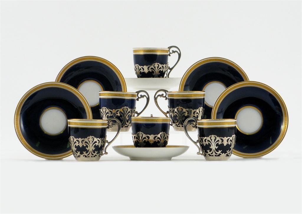 A Royal Worcester coffee set, of six cups and saucers, the cups with silver mounts and handles, the porcelain a deep blue with patterned gilt rims, hallmarks for Mappin & Webb, London, 1927. Cased.