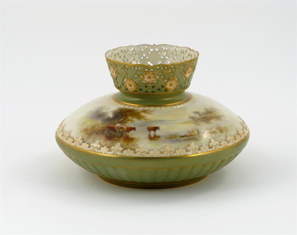 A Royal Worcester flattened circular vase, painted by John Stinton with cattle wading into a river, signed, below a tall neck reticulated with flowers and foliage, printed marks and date code for 1908, a faint base crack, 22cm.