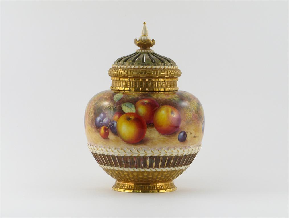 A large Royal Worcester pot pourri vase, inner and outer cover, luminously painted with peaches, grapes and cherries on a mossy ground, signed 'Freeman', above a gilded basketweave band, black printed mark, restoration to the cover, 27cm. (3)