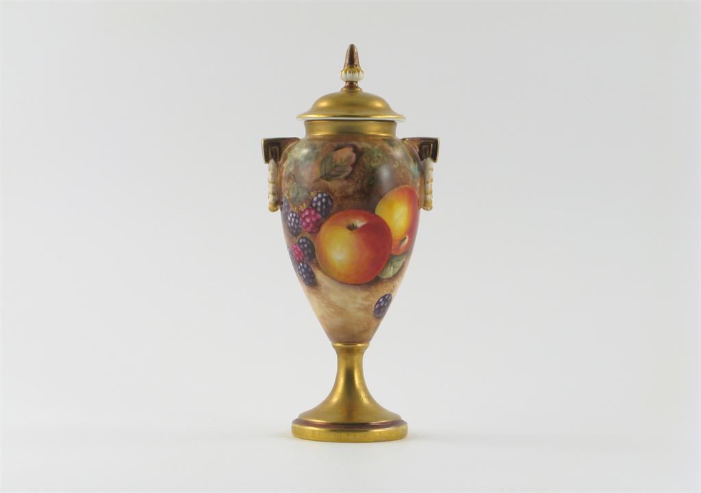 A Royal Worcester vase and cover, painted with apples, blackberries, peaches and grapes, signed 'P.Dines', printed black mark, a little restoration to the neck rim, 21cm. (2)