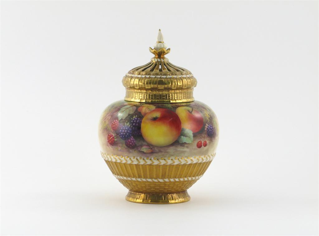 A Royal Worcester pot pourri vase, inner and outer cover, painted with rosy apples, blackberries and redcurrants on a mossy ground, signed 'T. Lockyer', above a gilded basketweave band, printed mark and date code for 1934, a restored rim chip, 20cm. (3)