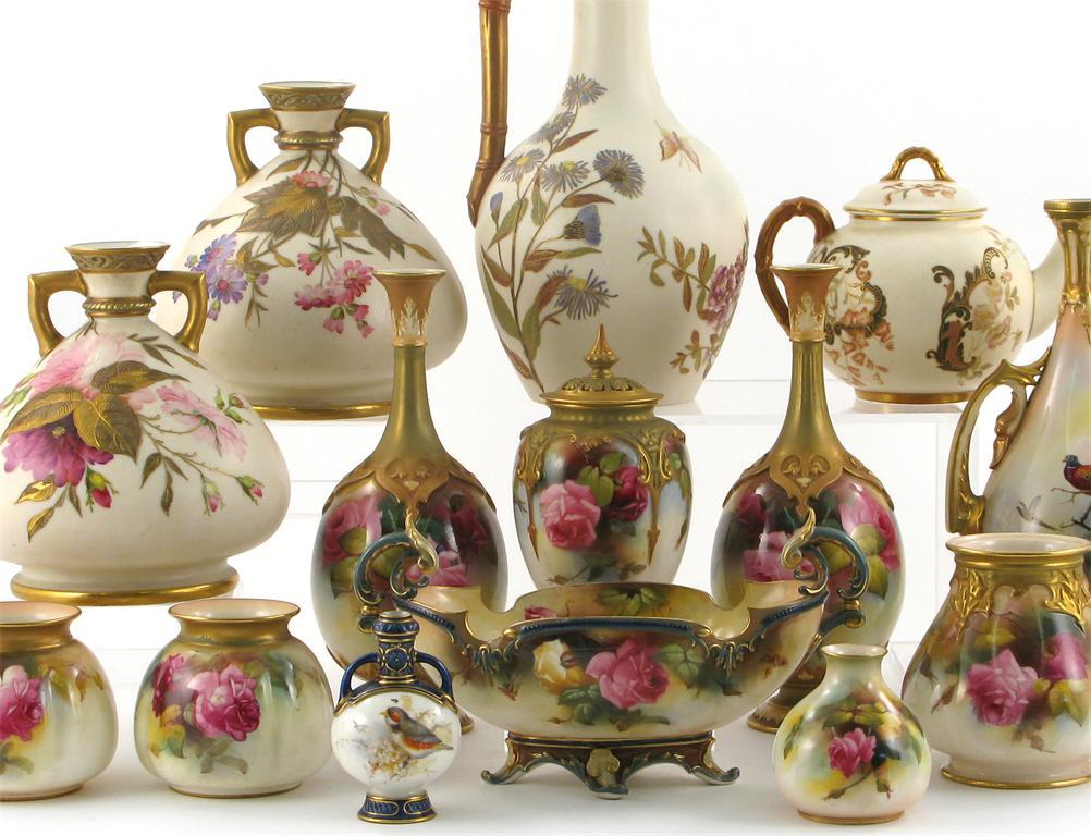 Various Royal Worcester porcelain, mostly decorated with roses and other flowers, printed marks and date codes between 1883 and 1926, some damages and repairs, 26.5cm max. (23)