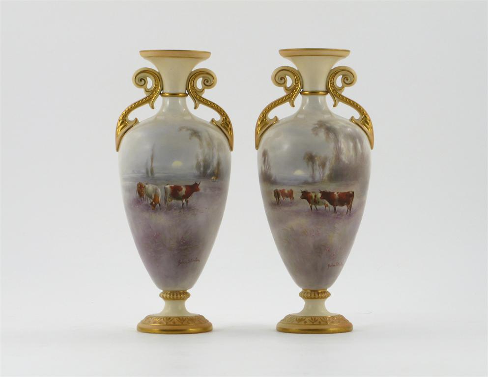 A pair of Grainger Worcester vases, painted by John Stinton with cattle in a flower meadow before trees, depicting sunrise and sunset, signed, shape 1001, printed marks and date codes for 1902, 24.2cm. (2)