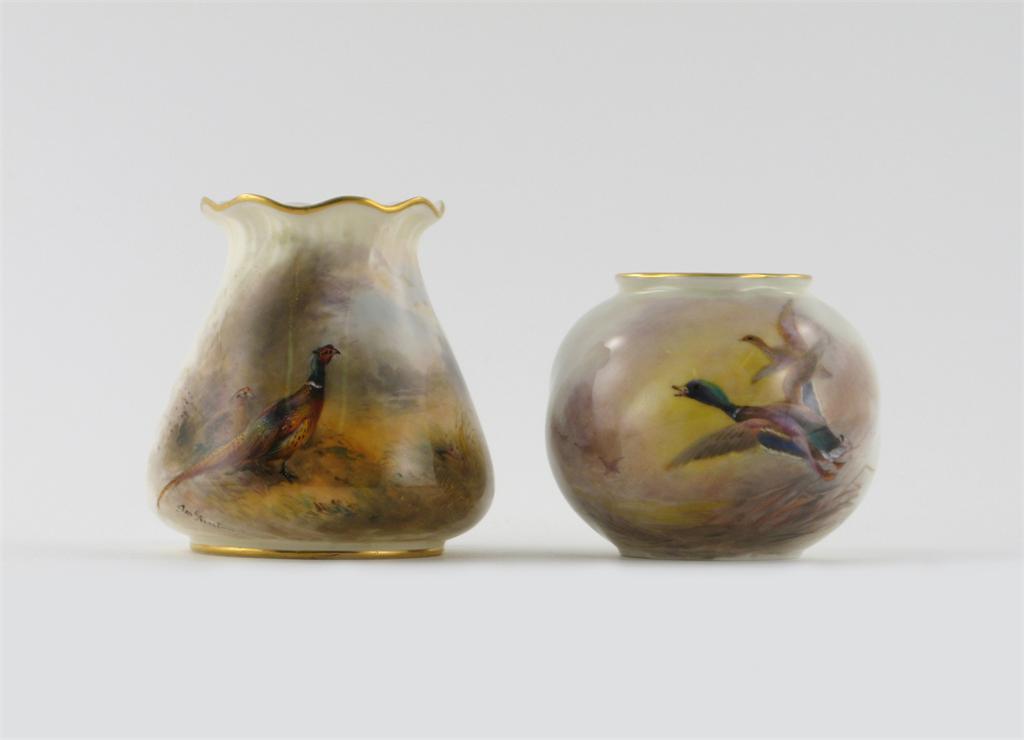 Two small Royal Worcester vases, painted by James Stinton, one with a pair of mallard ducks in flight, the other with pheasants, signed, printed marks and date codes for 1930 and 1938, 8cm max. (2)