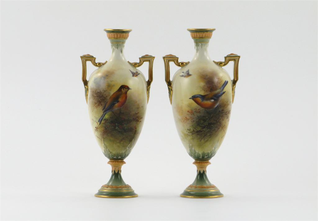 A pair of Royal Worcester two-handled vases, painted with songbirds perched in branches and flying above, signed 'E.Barker', printed marks and date codes for 1909, 17.7cm. (2)