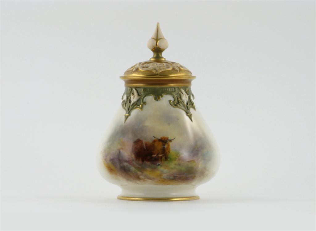 A Royal Worcester pot pourri vase and cover, painted by Harry Stinton with two Highland cattle, signed, the neck rim decorated with raised stylized leaf points, the cover with foliate reticulation, printed mark and date code for 1912, 17cm. (2)