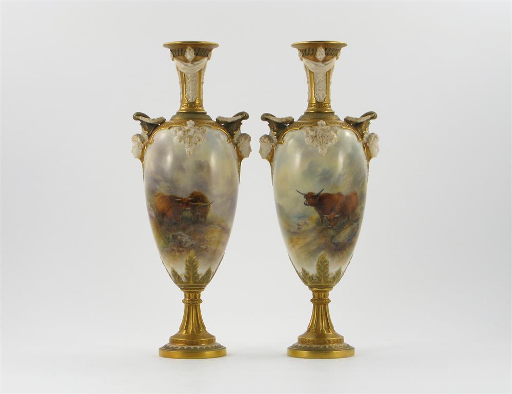A large pair of Royal Worcester vases, painted by John Stinton, each with two Highland cattle by a mountain stream, signed, the shoulders with mask head handles, the necks with fabric swags issuing from grotesque masks, shape 1410, printed marks and a date code for 1920, 38.2cm. (2)
