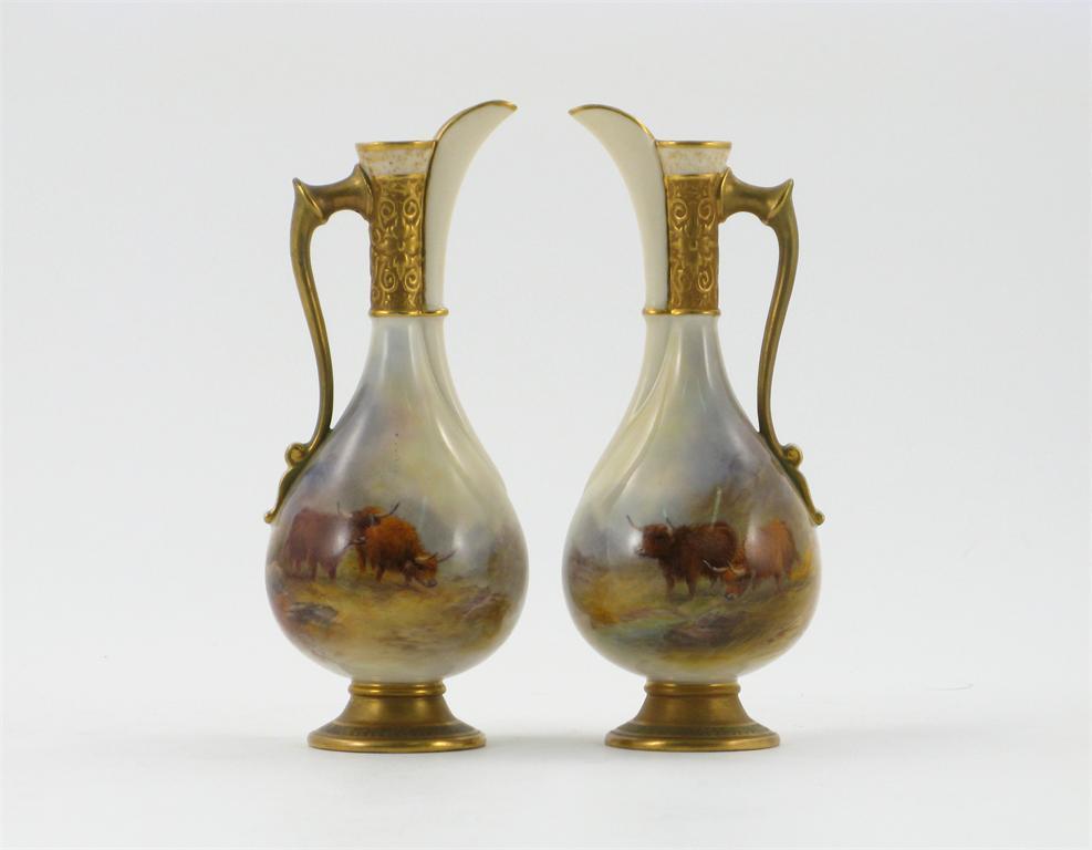A pair of Royal Worcester small ewers, painted by Harry Stinton with Highland cattle in misty mountain landscapes, signed, the necks moulded with scrolling stylized floral decoration, shape 779, printed marks and date codes for 1913, 18cm. (2)