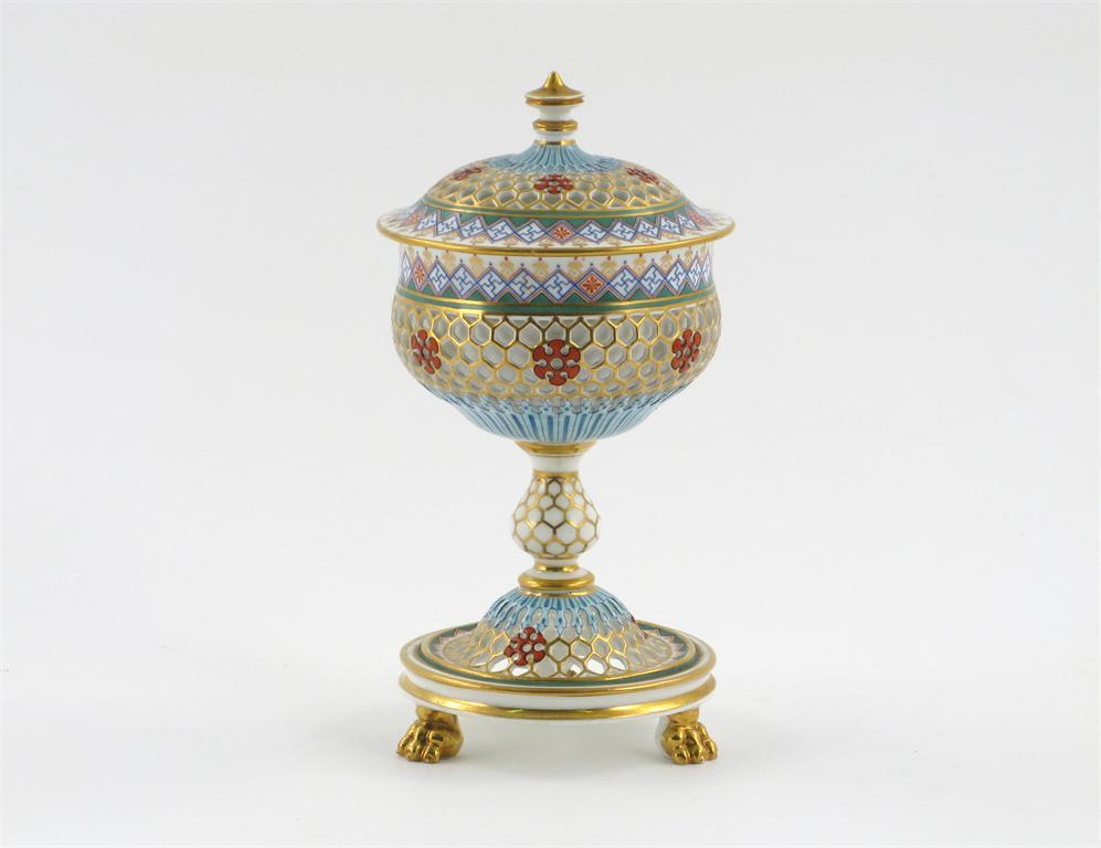 A Chamberlain's Worcester double-walled reticulated vase and cover, raised on a honeycomb knopped stand and three claw feet, c.1840-50, puce factory marks, 19cm. (2)