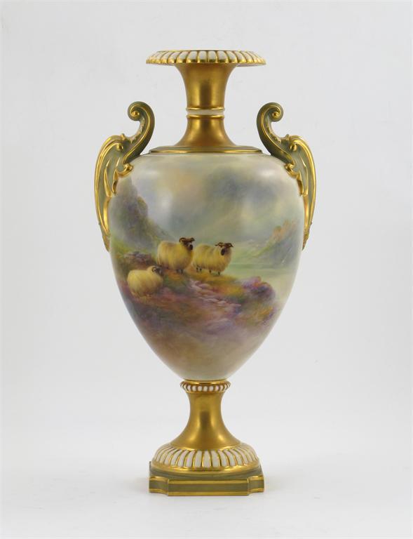 A large and good Royal Worcester two-handled vase, painted by Harry Davis with three sheep by a stream in moorland landscape, raised on a gilded and ribbed foot, signed, shape 1969, printed mark and date code for 1912, 41cm.