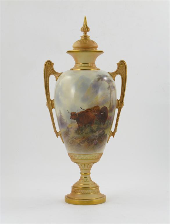 A large Royal Worcester vase and cover, painted by John Stinton with three highland cattle in a tree filled mountain landscape, the reverse with a stream forging its way through the rocky hills, signed, shape 1481, printed mark and date code for 1910, 47.5cm. (2)