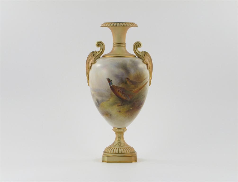A large Royal Worcester twin-handled vase, painted by James Stinton with a pair of pheasants in a hillside landscape, signed, printed mark and date code for 1909, 32cm.