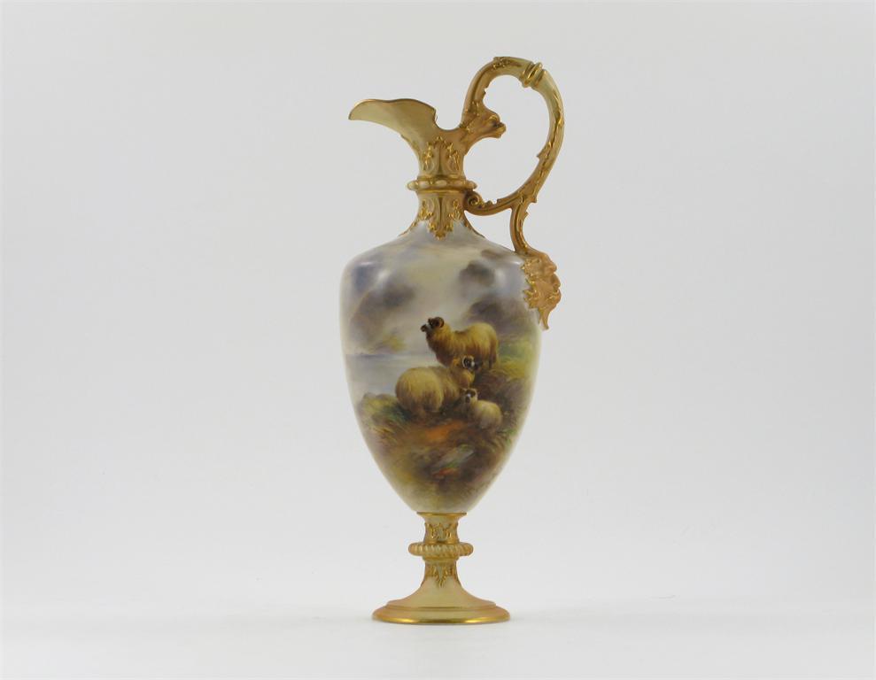 A good Royal Worcester ewer, the flattened body painted by Harry Davis with a family of three sheep beside a mountain tarn, signed, the blush foliate handle issuing from a moustachioed mask and terminating in a stylized dolphin head, shape 789, printed mark and date code for 1908, 32.7cm.