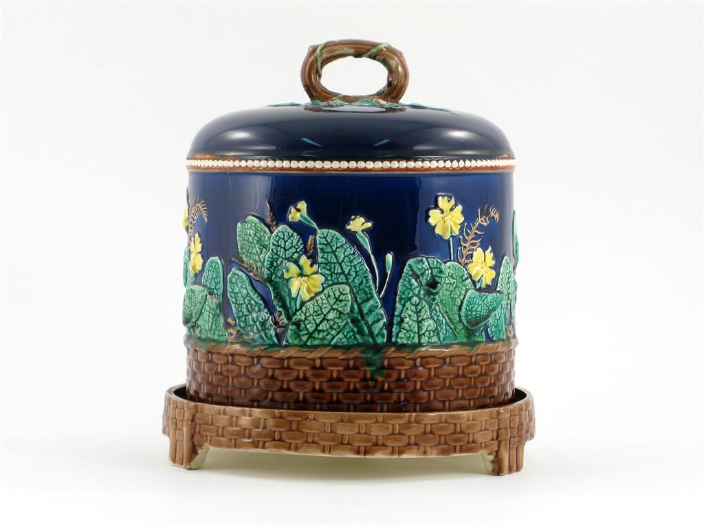 A Wedgwood Majolica cheese bell and stand, moulded with primroses above a basketweave border, the handle twined with ivy, impressed marks, 19th century, a few small chips, 27cm. (2)