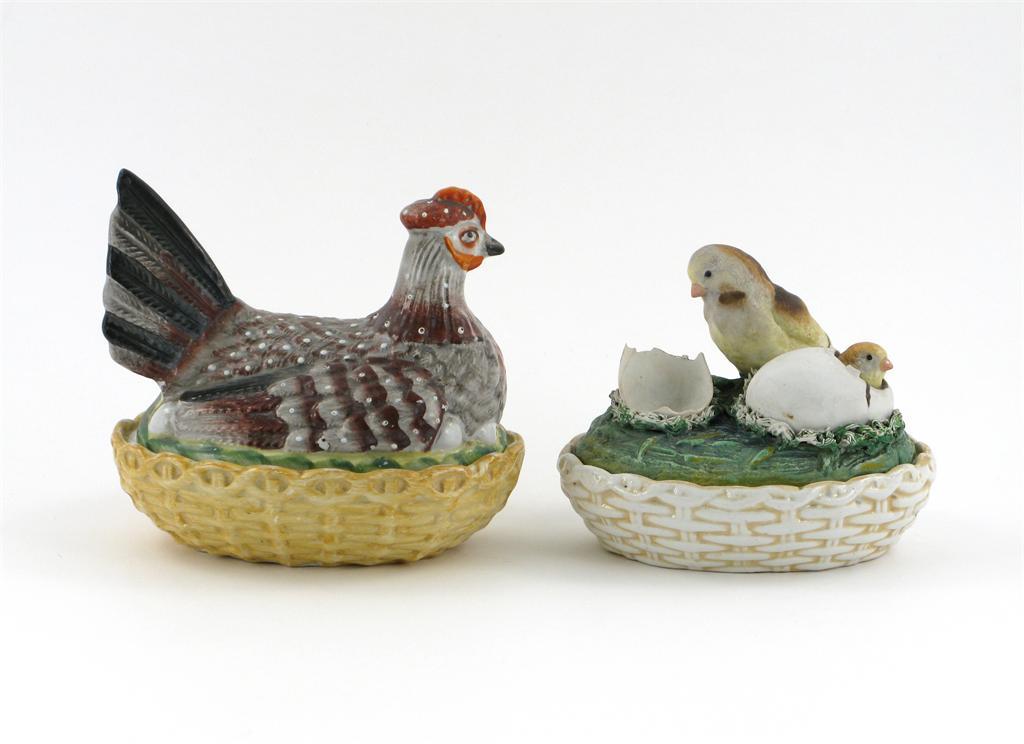 An unusual Staffordshire chicks box and cover, one newly born chick standing beside the remains of his egg, the other poking its head through the shell, and a chicken box and cover, 19th century, the broken shell perhaps damaged, 18.3cm max. (4)