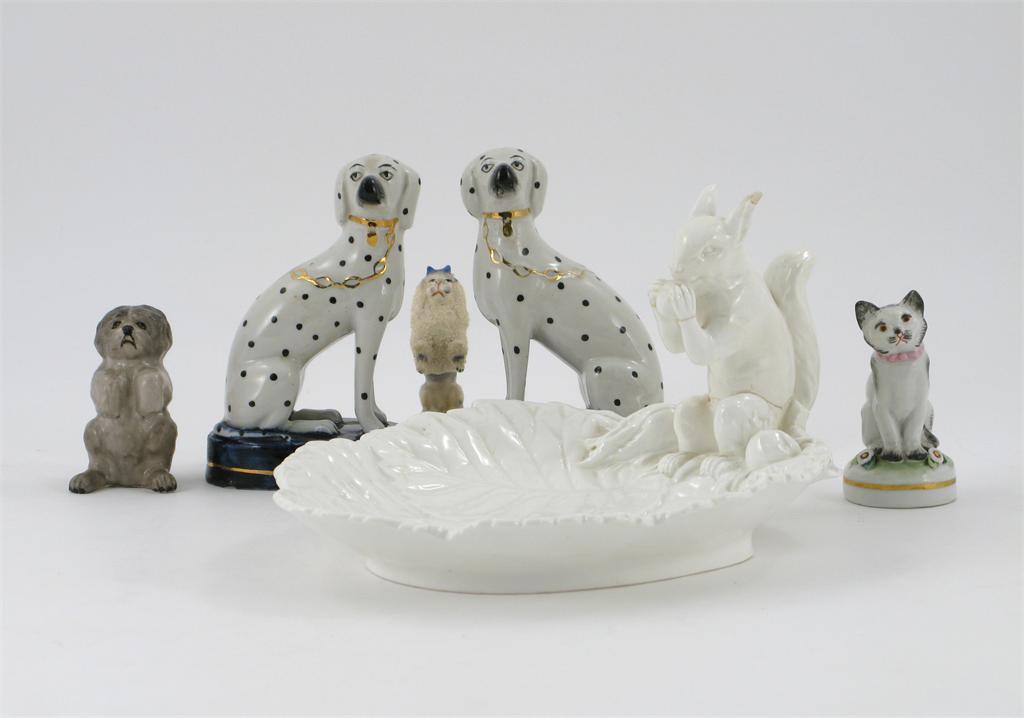 A Minton white-glazed leaf dish, surmounted with a squirrel nibbling a nut, a pair of Staffordshire seated dalmatians, a poodle begging on its haunches, a similar Derby terrier, and a ribboned cat, 19th century, some damages, 24cm. (6)