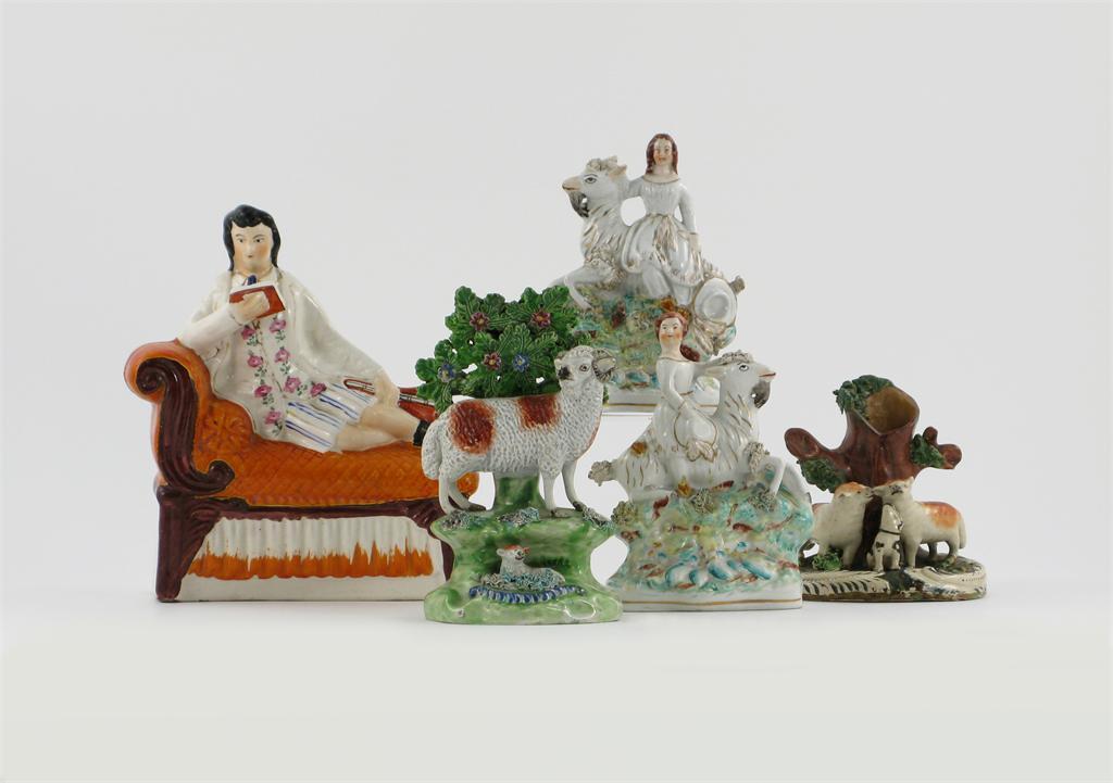 A Walton pearlware sheep group, a Staffordshire spill vase of two sheep and a dog before a tree, a pair of figures of the Royal children astride goats, and a Staffordshire figure of a musician recumbent on a day bed, 19th century, some damages and restoration, 21.5cm max. (5)