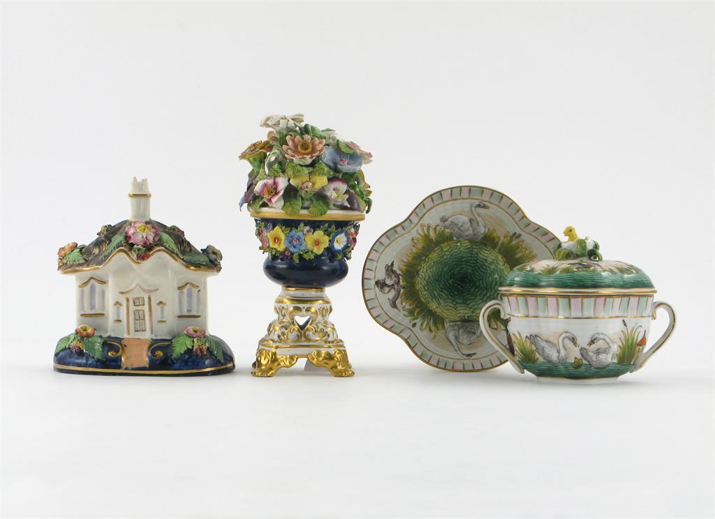 A Doccia-style two-handled cup, cover and saucer, moulded with swans, ducks and grebes, a pastille burner modelled as a cottage, and a Bloor Derby vase of flowers, 19th century and later, minor damages, 15.5cm max. (5)