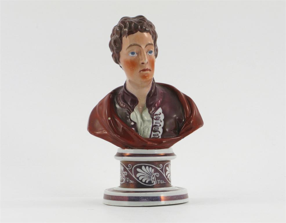 A pearlware bust of David Garrick, raised on a purple lustre circular socle, draped in a dark red robe, early 19th century, 20cm.