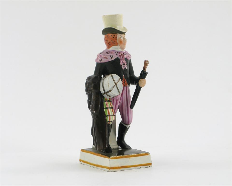 A Staffordshire pearlware figure of the actor John Liston, in the role of the mischievous gossip, Paul Pry, carrying his famous umbrella prop in his left hand, c.1826-30, some good restoration, 15.3cm.