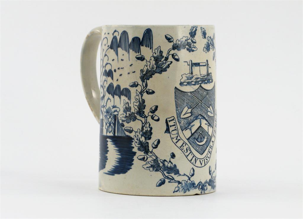 A rare and large pearlware blue and white mug, printed with a coat of arms and the motto "Itum Est in Viscera Terrae", within a border of oak branches laden with acorns, an Oriental landscape either side, c.1800, a flat footrim chip to the base, 15.5cm.