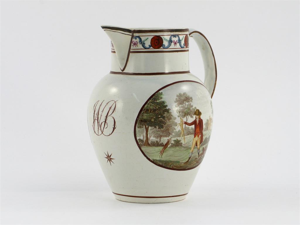 A pearlware hunting jug, one side painted with a fox being chased by a dog, while his red-coated master looks on, the other side with the huntmaster holding the caught fox before his excited hound, late 18th century, restoration to the spout, 20.8cm.
