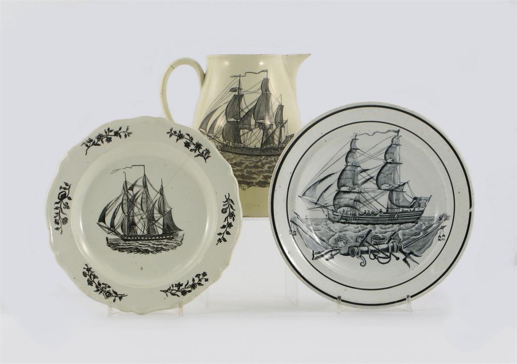 Shipping interest: a dated creamware jug, printed with a view of Liverpool Lighthouse on Bidston Hill, a Swansea pottery plate decorated with a two-masted ship above maritime motifs, and a Herculaneum plate printed with a ship within a floral border, some damages, 22.7cm max. (3)