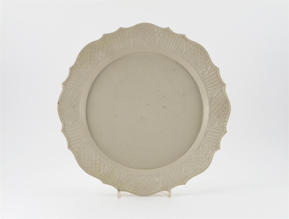 A large English salt-glazed dish, the shaped rim moulded with panels of osier and diaper ground, 2nd half 18th century, some damage, 35cm.