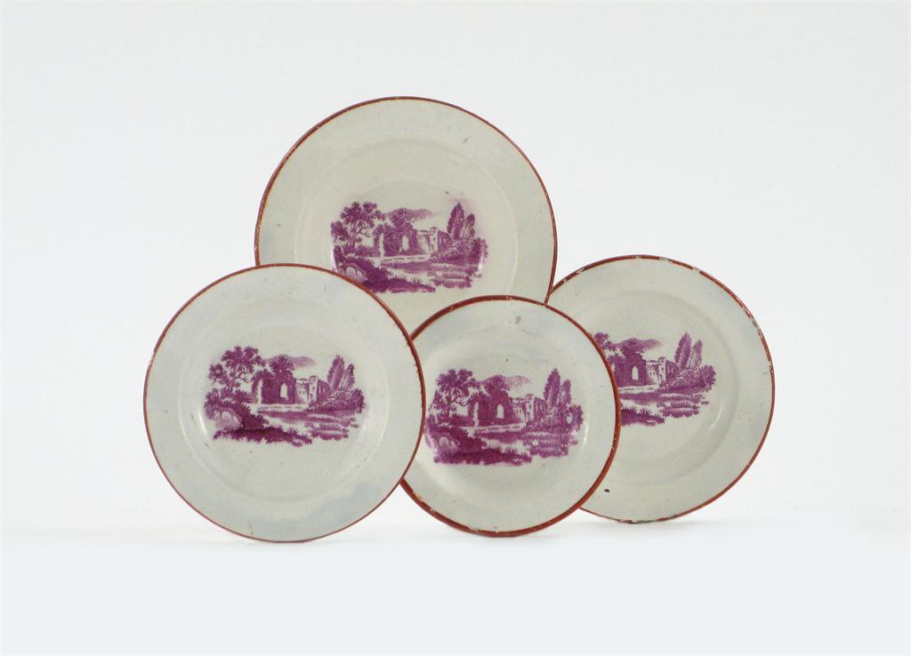 Four miniature pearlware dishes, printed in puce with Classical ruins in a tree-lined landscape, early 19th century, a few minor rim nibbles, 8.7cm max. (4)