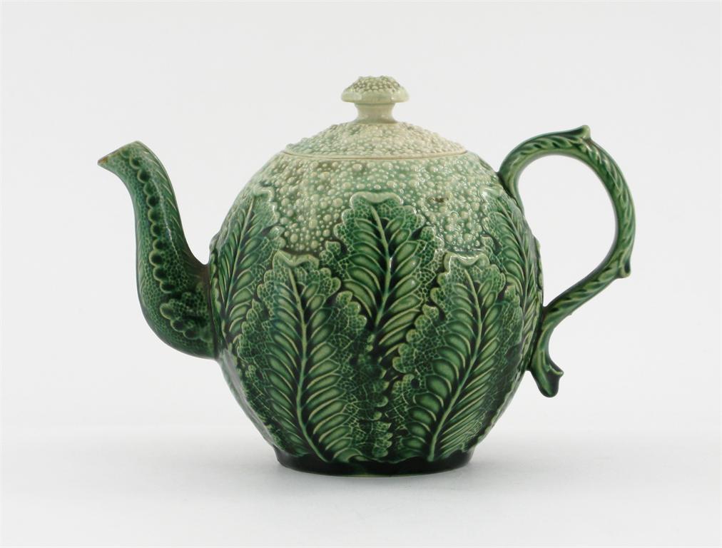 A creamware cauliflower teapot and cover, the lid and shoulders moulded as the creamy flower, the handle, spout and base as the darker green leaves, 19th century, a crack to the base, 18cm. (2)