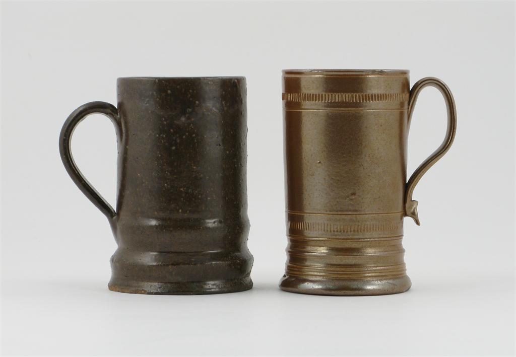 Two brown stoneware cylindrical mugs, one with ridged borders, late 18th / early 19th century, small chips, 17cm max. (2)