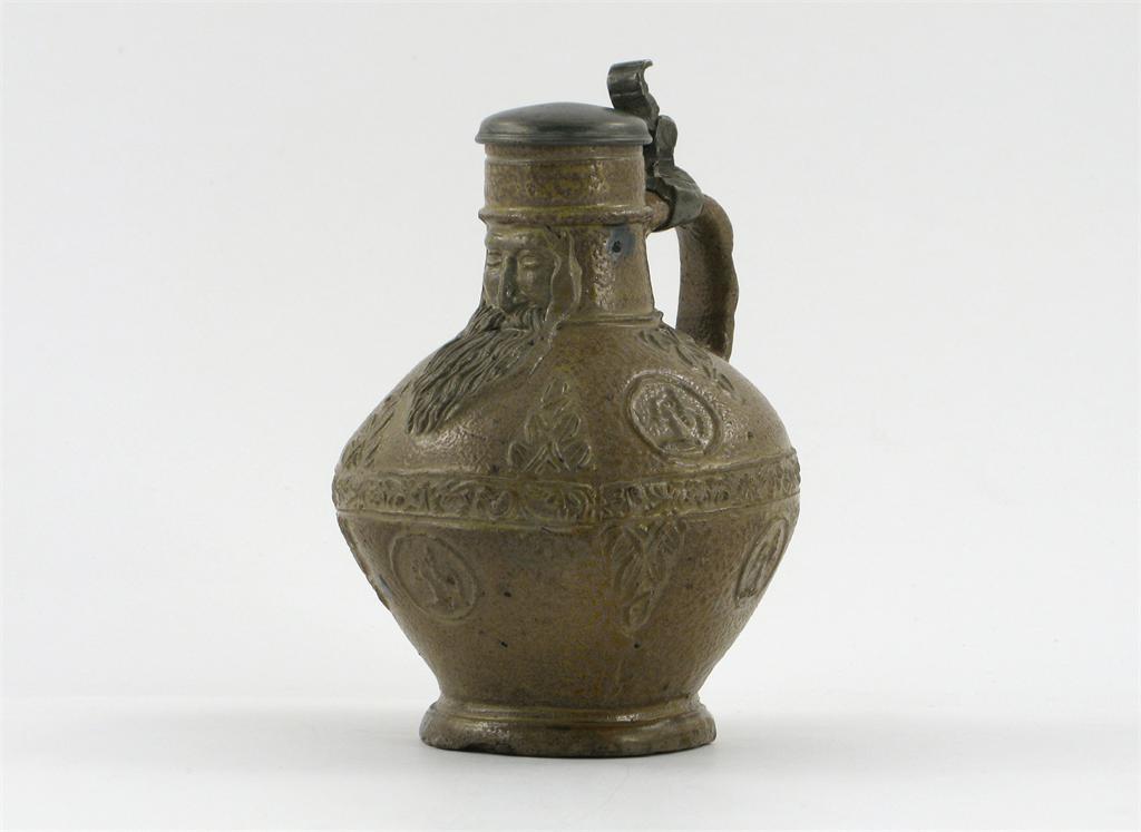 A German stoneware Bellarmine or Bartmann's type jug, moulded with five portrait medallions and the bearded visage of Cardinal Robert Bellarmine, a hinged pewter lid, 18th century, a few small chips, 18.5cm.