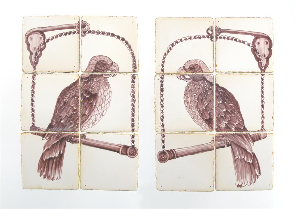 A pair of Delft tile panels, each painted in manganese with a large parrot sitting on a hanging perch, six tiles to each panel, unmounted, 38cm. (12)