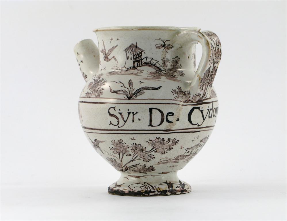 An unusual manganese Delft wet drug jar, painted with a disturbance at the heron house, five of the birds fleeing to find the river, around the inscription 'Syr. De Cydonys', 18th century, 21cm.