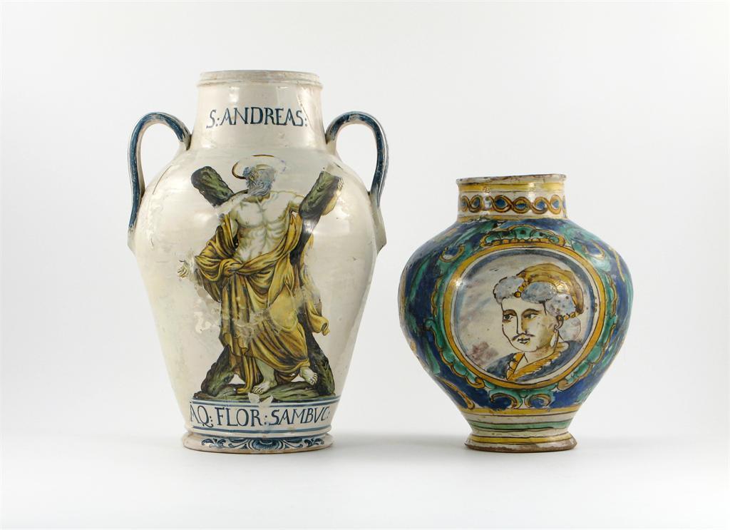 A Sicilian maiolica globular jar, painted with the portrait of a turbaned man on a ground of green, blue and yellow foliage, and a faïence two-handled drug jar painted with St Andrew tied to his cross and titled 'S: ANDREAS: AQ: FLOR: SAMBVC', 18th / 19th century, damages and restoration, 36cm max. (2)