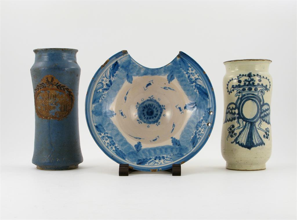 A Continental tin-glazed albarello, painted with two birds, back to back beneath a crown, a blue-glazed albarello, and a tin-glazed barber's bowl, painted with a garlanded border and stylized leaves, 18th and 19th centuries, some damages, 27.5cm max. Together with a wood stand. (4)