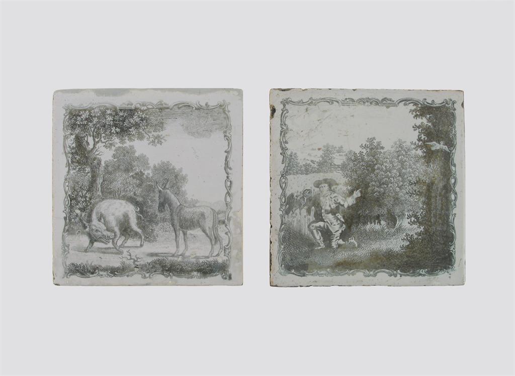 A pair of delftware Fable tiles, printed by Sadler and Green, one with Aesop's tale of The Boar and the Ass, the other with The Hawk and the Farmer, the king of birds mistaken for a crow, c.1760-70, a little damage and restoration, 12.6cm. (2)