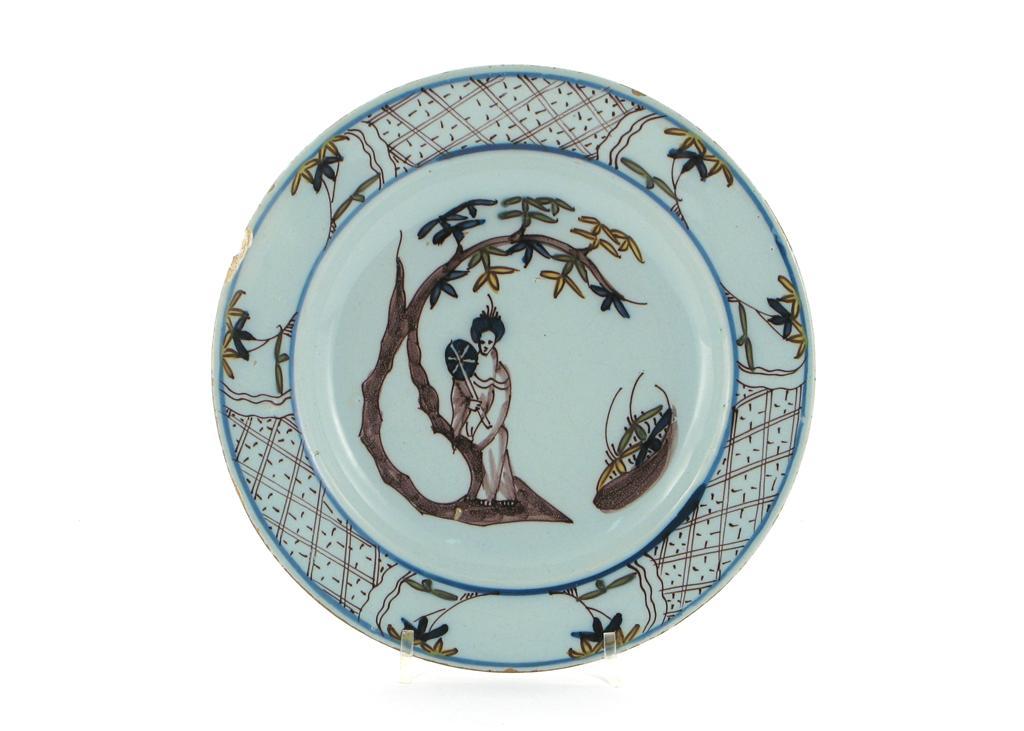 A Bristol Delftware polychrome plate, painted in shades of blue, green, yellow and manganese with an Oriental lady seated on a branch of a tree, holding a flat fan, within a hatched and bamboo border, c.1760, a 2cm rim chip, 22.5cm.