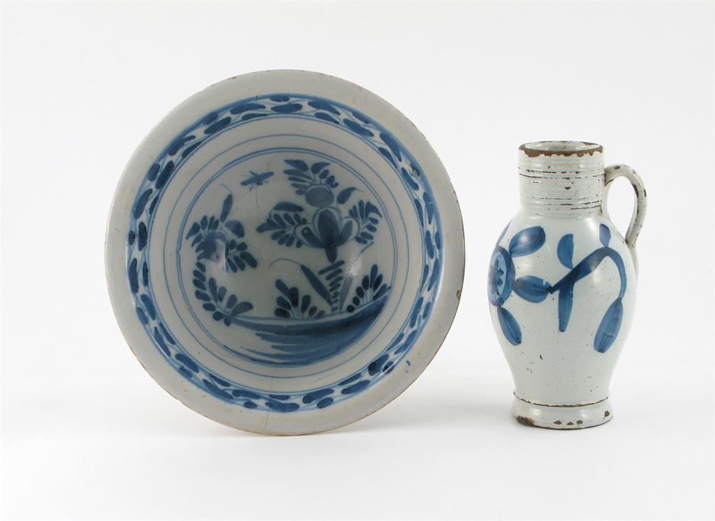 A Delftware bowl and jug, the bowl's interior painted with stylized Oriental blooms and an insect, the jug with a large bloom below a ribbed neck, 2nd half 18th century, damage and restoration, 22.5cm max. (2)