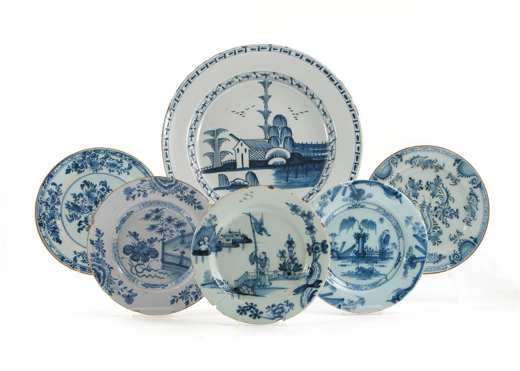 Fourteen Delftware blue and white plates, variously painted with Oriental landscapes, flowers, figures and geometric designs, one with a manganese border, 18th century, damages, 36.5cm max. (14)