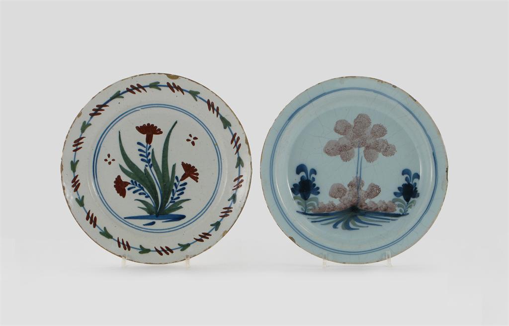 Two delftware plates, one painted with flowers in red, blue and green, the other sponged with a manganese tree, 18th century, some minor rim chips and frits, 22.7cm max. (2)