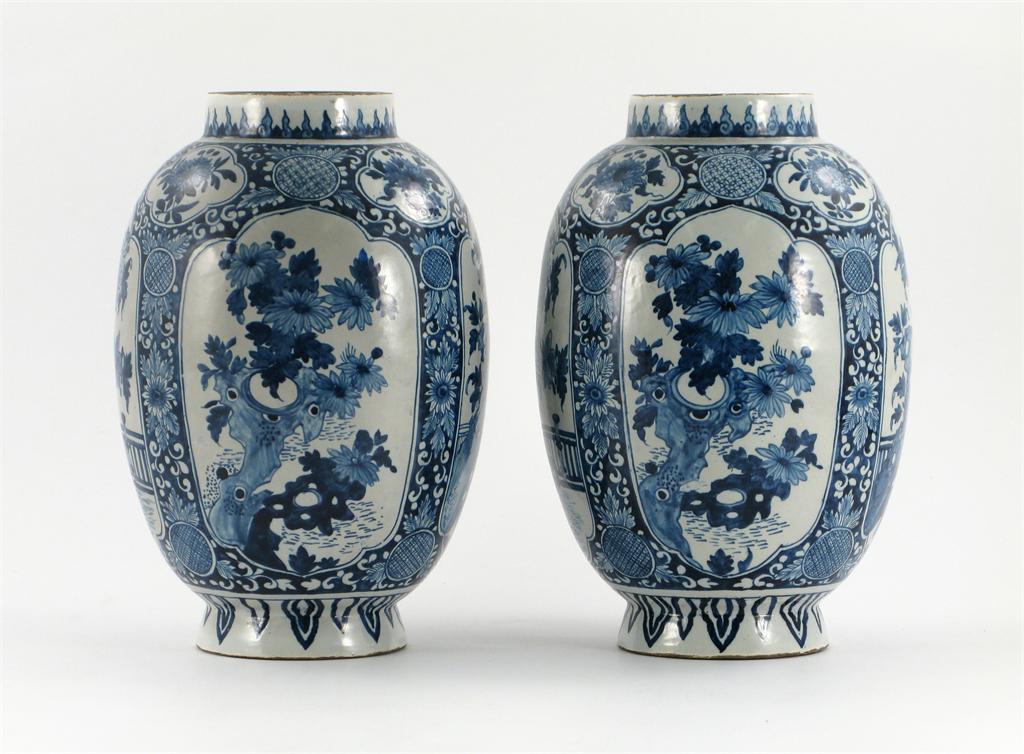 A pair of Dutch Delft blue and white vases, painted in the Japanese style with panels containing chrysanthemum, peony and rockwork, various marks, c.1800, the covers lacking, 28cm. (2)