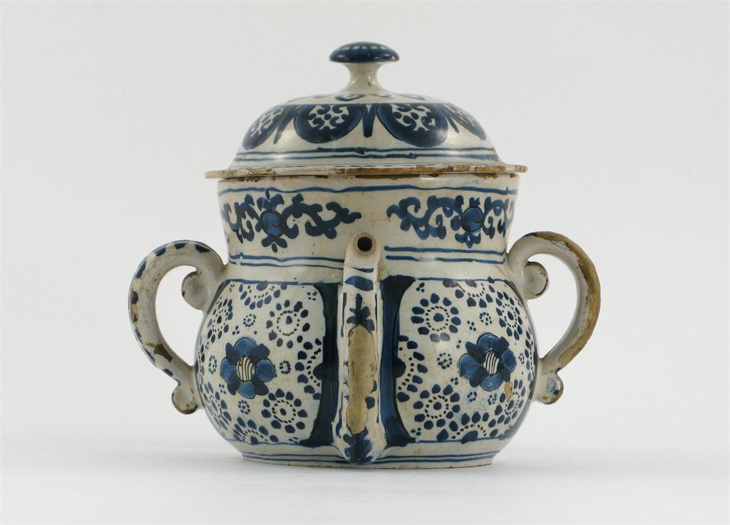 A Delft blue and white posset pot and cover, painted with four panels containing geometric floral designs, below a scrolling border, 2nd half 18th century, damages and restoration, 23cm. (2)