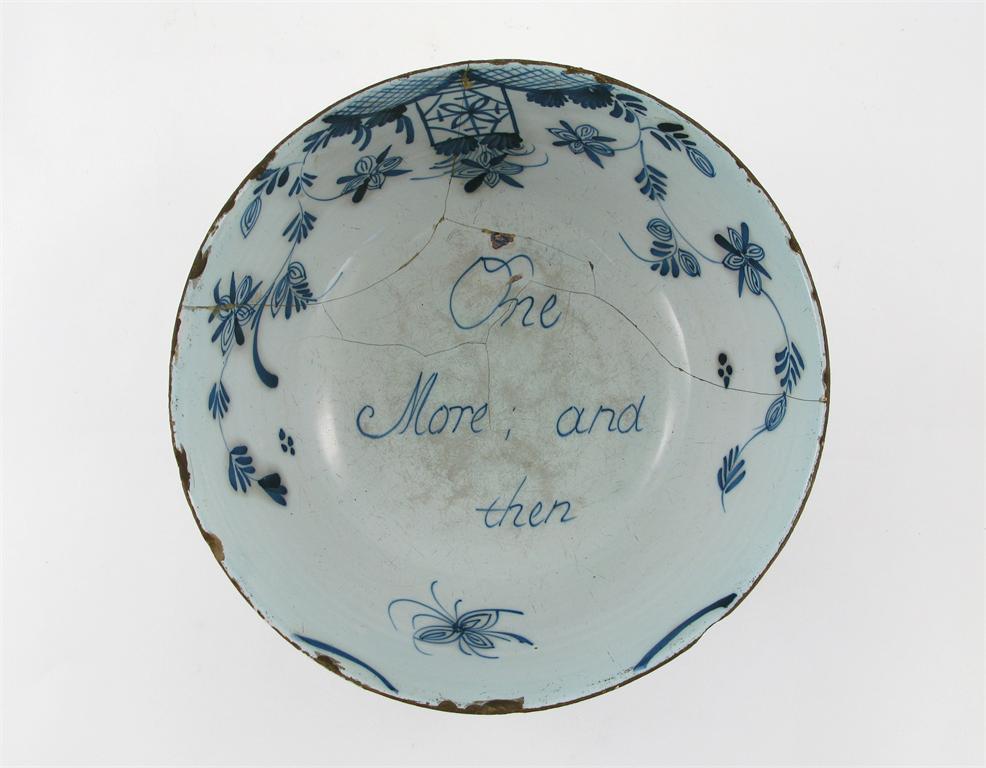 A Delftware blue and white punch bowl, the interior bearing the drinking man's slogan 'One More, and then', the exterior painted with stylized Oriental flowers and motifs, 2nd half 18th century, broken and riveted, 16.8cm.