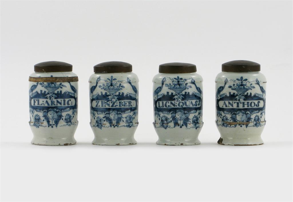 A set of four small Delft drug jars with metal covers, titled within cartouches of peacocks, fruit baskets and angel masks, late 18th century, minor damages, 13cm. (8)