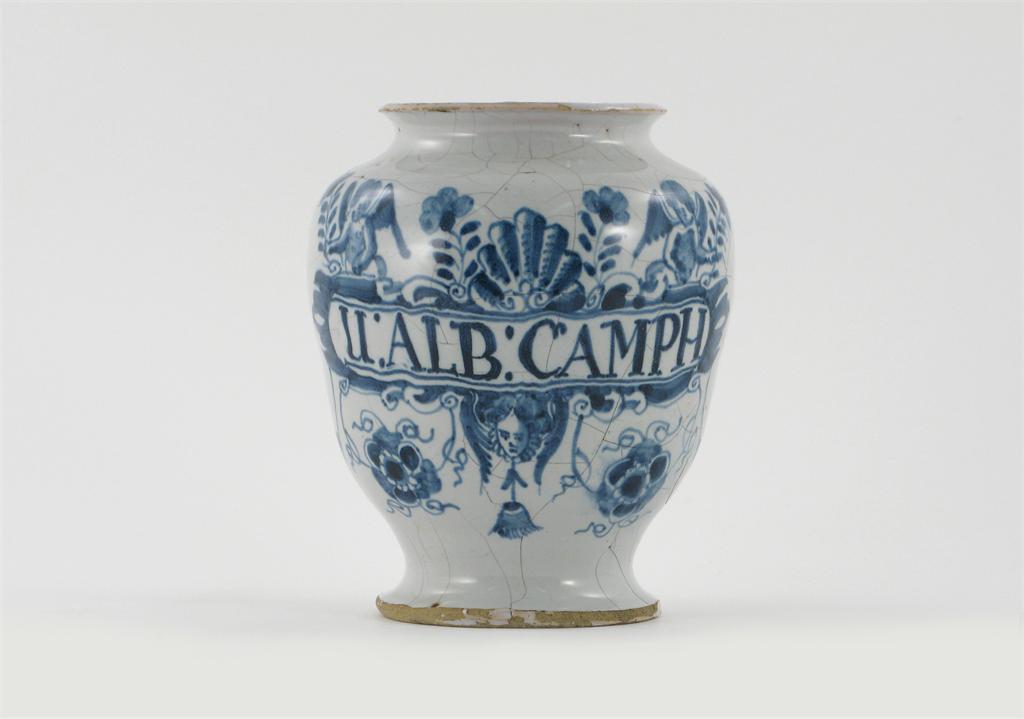 A delftware dry drug jar, typically decorated with two cherubs holding flowers, either side of a large shell, the banner reading 'U:ALB:CAMPH', 18th century, a section of the rim restored, 18cm.