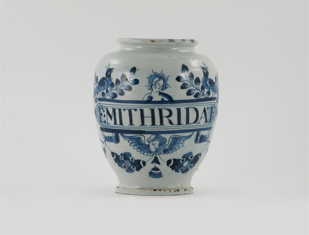 Mithridatum was a pharmaceutical preparation used as an antidote to poisons. Apollo is a key figure in the Apothecaries' Society coat of arms, hence his inclusion in drug jar decoration.