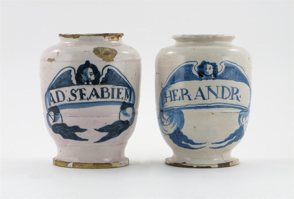 Two early delftware dry drug jars, each lightly ribbed body painted in blue with a ribbon cartouche surmounted by and angel with outspread wings, titled THER ANDR and AD:SEABIEM, late 17th century, some chipping, 19cm. (2)