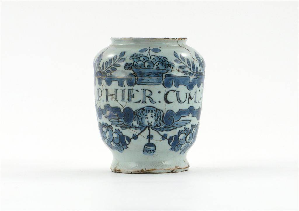 An unusual delftware small drug or pill jar, painted with a cartouche of songbirds and a fruit basket above garlands issuing from angels around the inscription, P:HIER:CUM:A, 18th century, extensively broken and repaired, 9cm.