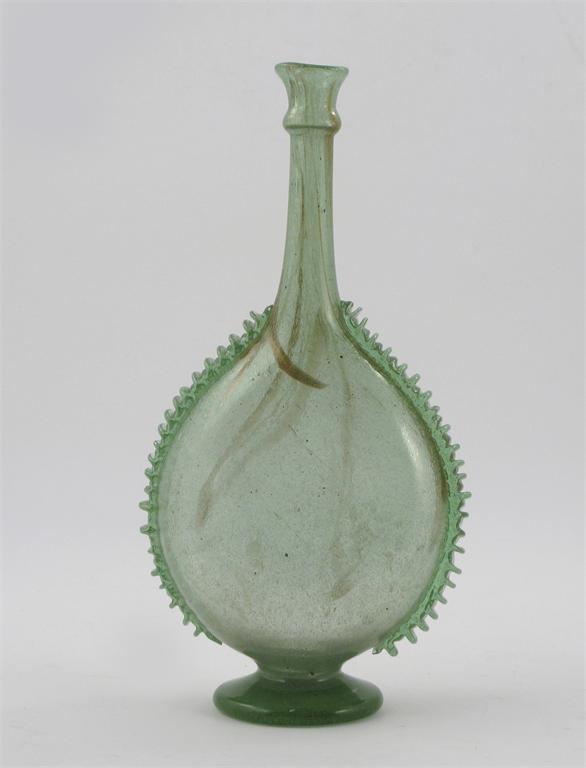 A James Couper & Sons Clutha glass bellow-shaped solifleur vase pitted green glass with aventurine and air bubble inclusions, applied with ribbed decorative handles unsigned 30cm high